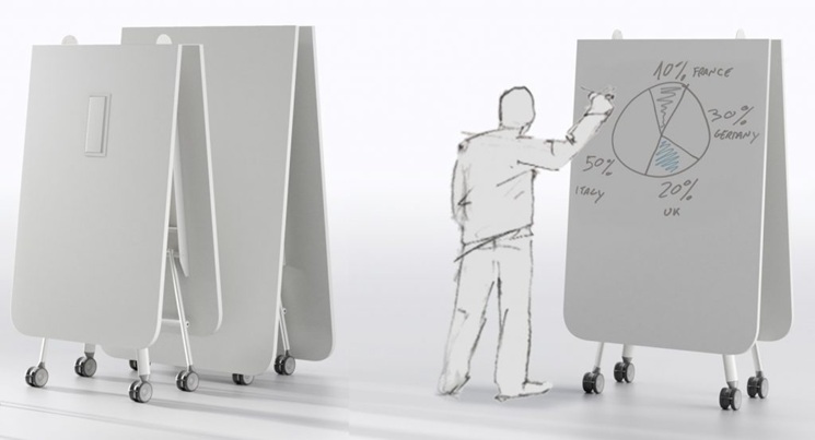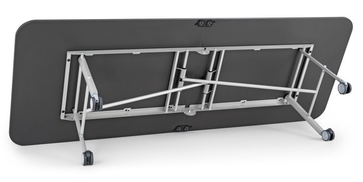 Der faltbare Besprechungstisch bietet eine großzügige Arbeitsfläche, lässt sich bequem einklappen und ist auch von nur einer Person einfach zu bedienen. Bei Nichtgebrauch kann das Gestell aufgeklappt und kompakt geparkt werden oder als Whiteboard genutzt werden.