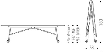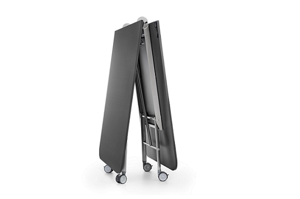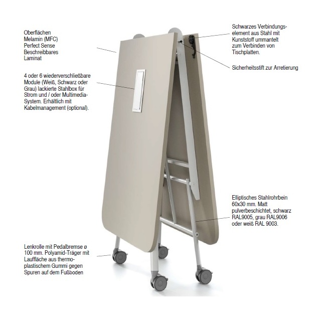 Das Gestell verfügt über große Rollen mit Feststellbremse, sodass der Tisch schnell und einfach in einen anderen Raum gebracht werden kann. Innerhalb kürzester Zeit ist der Falttisch für Meeting, Seminar oder Schulung vorbereitet. Darüber hinaus verfügt der Tisch noch über optionale Zusatzfunktionen wie Tischverbinder oder eine beschreibbare Tischplatte. Somit kann der Tisch auch zusammengefaltet als Whiteboard genutzt werden, was den Falttisch im Büro noch vielseitiger nutzbar macht.