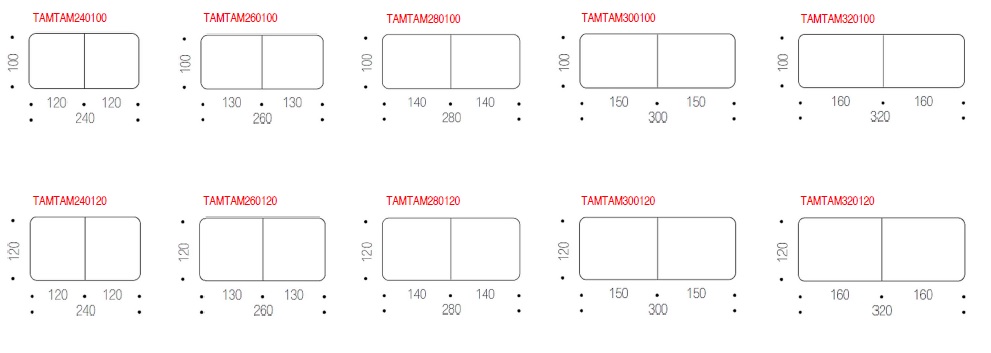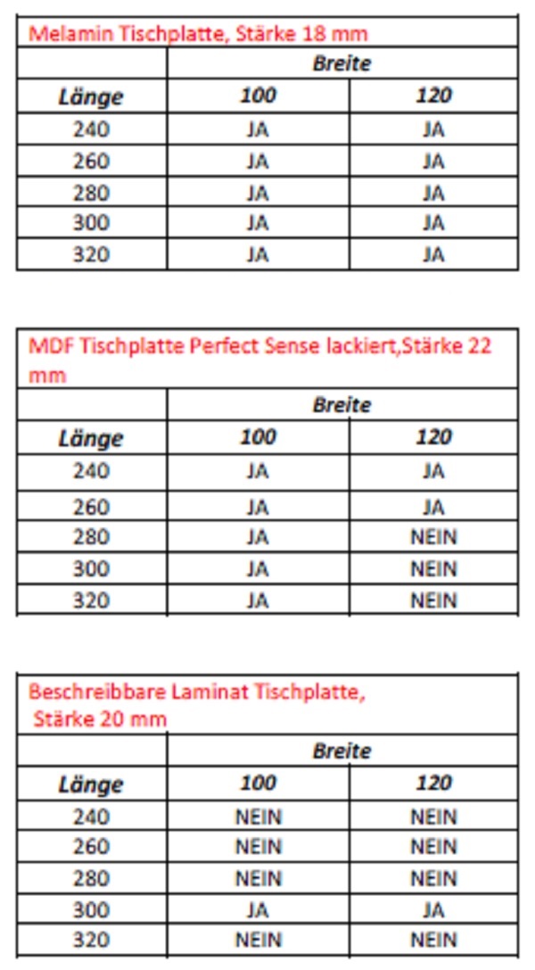 - Tischplatte in mehreren Formaten von 100 x 240 cm bis 120 x 320 cm. Abgerundete Kanten oder 90-Grad-Kanten für Mehrtisch-Konfigurationen