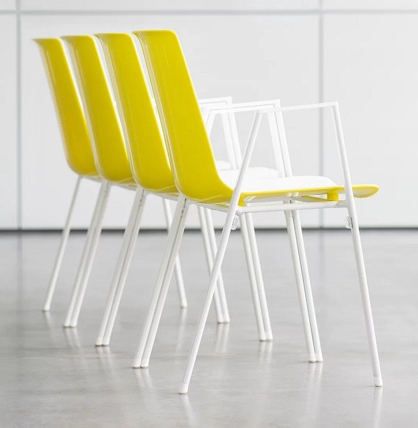 Gestell Präzisions-Stahlrohr, Universalgleiter aus Kunststoff für weiche und harte Böden. Sitzschale Sperrholz Buche oder Polypropylen (uni oder bicolor). Die Außenseite der Kunststoffschale weist immer eine Hochglanzoberfläche auf. Armlehnen-Pads bzw. Gestellpads bei Stuhl ohne Armlehnen Kunststoff. Verkettungs- und Stapelelement Kunststoff. Metalloberfläche pulverbeschichtet.