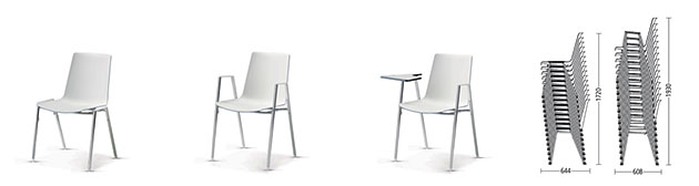 Ein Kunststoffclip im oberen Bereich der Lehne dient als Sitznummerierung (optional), auf Wunsch können Reihenstühle mit Armlehnen mit einem klappbaren, abnehmbaren Schreibtablar ausgerüstet werden. Stühle mit montiertem Schreibtablar können gestapelt, jedoch nicht verkettet werden.