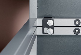| Kabelschacht (optional) für komfortables Plug-in über Tischniveau. | Metall-Verketter (optional) zur Verkettung beim Aufbau von Konfigurationen. |